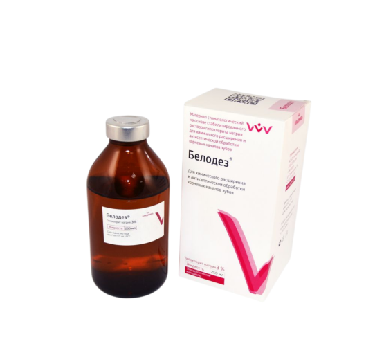 Гипохлорит натрия, входящий в состав Белодеза растворяет основу зубного дентина, при этом гелеобразная консистенция позволяет применять его на верхней челюсти. Уничтожает все виды вредоносных микроорганизмов, растворяет остатки пульпы.
