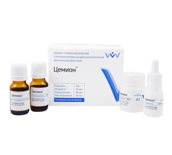 Цемион – цемент с быстрым химическим отвердением, с многокомпонентным составом из порошка, жидкости, кондиционера и покрывного лака. Это позволяет восстановить и максимально защитит пораженный зуб.